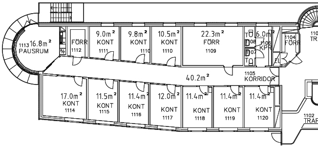 Flygeln på våning 1 är på cirka 155 m2 som uthyres i sin helhet enligt ritningen nedan. Vi har även enstaka singelkontor på 10–30 m2/rum på entréplan.