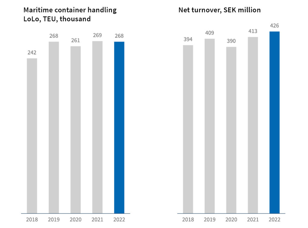 Within the container segment, The Port accounted for good stability through most of the year, even though The Port of Helsingborg lost a weekly call in connection with the union-associated sanctions against Russian-related vessels in the first half of 2022, and that import volumes were negatively impacted by inflation during the last quarter. The Port’s results are on par with last year’s 272,000 handled TEUs* by sea.